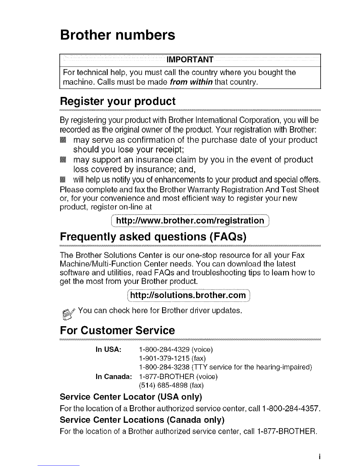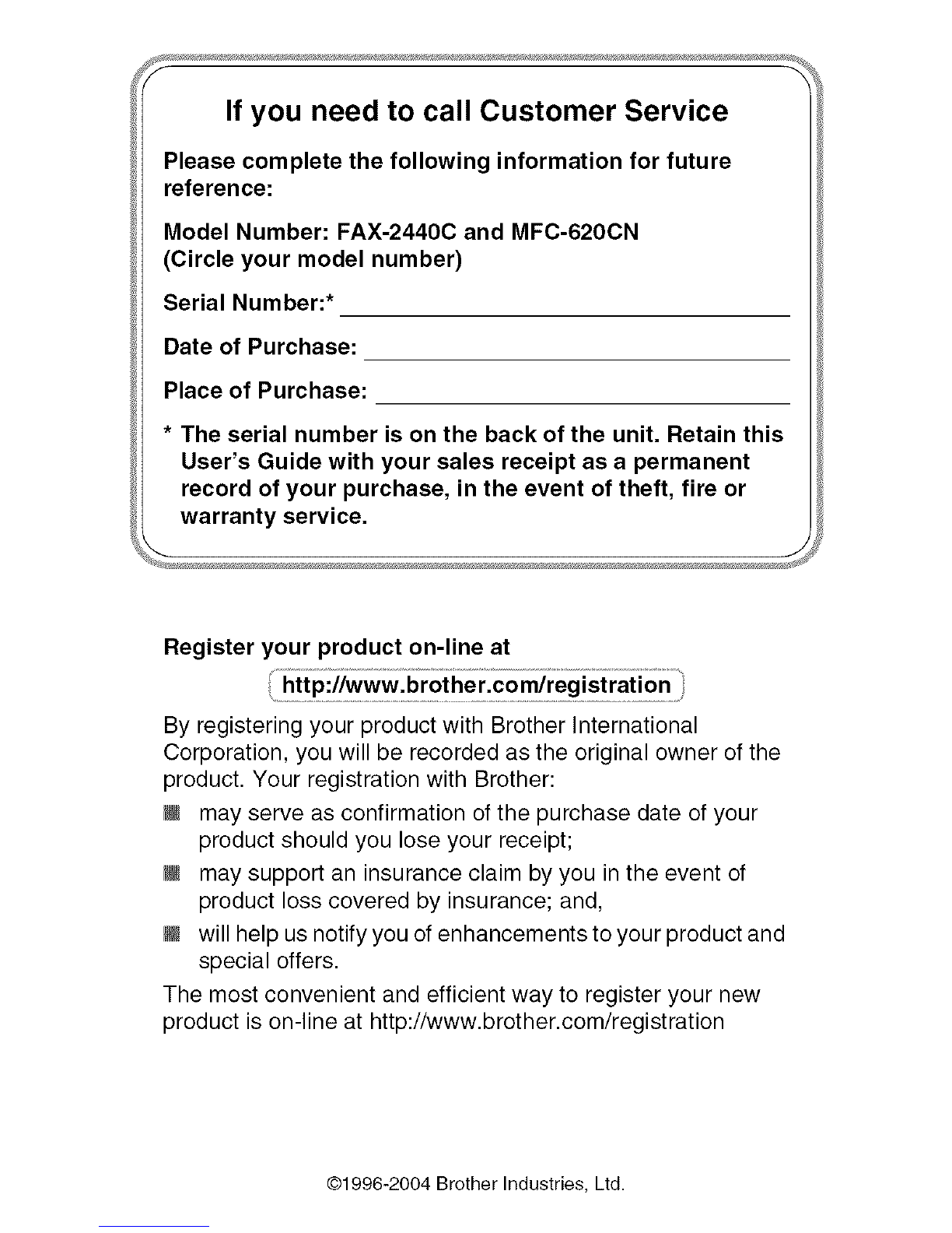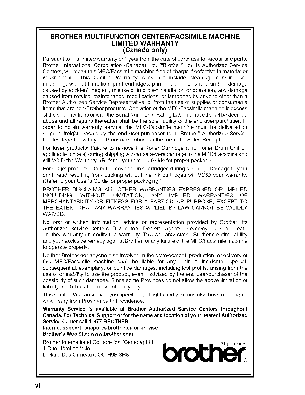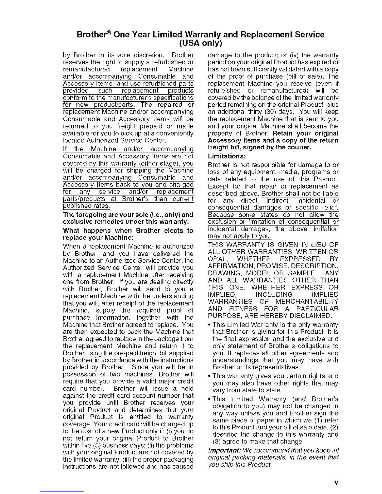 Brother ®One Year Limited Warranty and Replacement Service