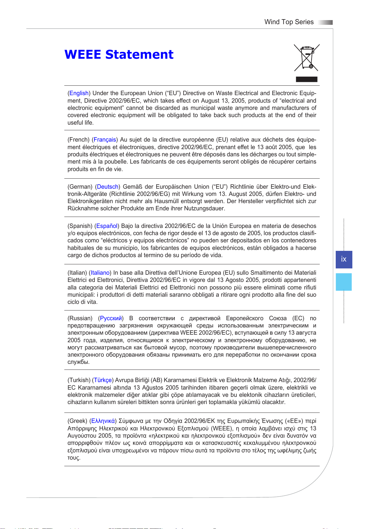 (Greek) (Ελληνικά) Σύμφωνα με την Οδηγία 2002/96/ΕΚ της Ευρωπαϊκής Ένωσης («ΕΕ») περί